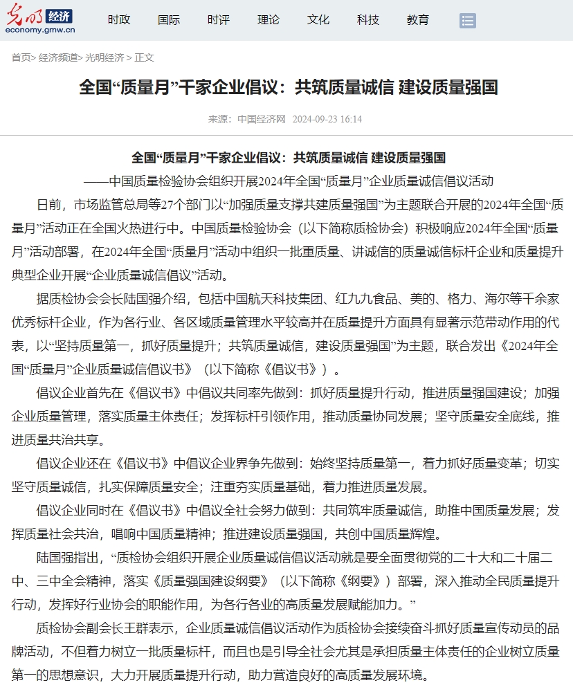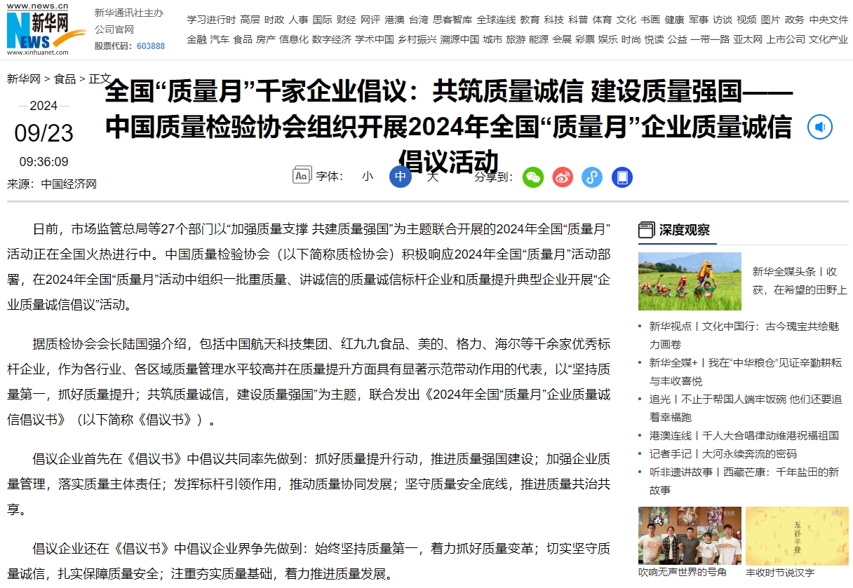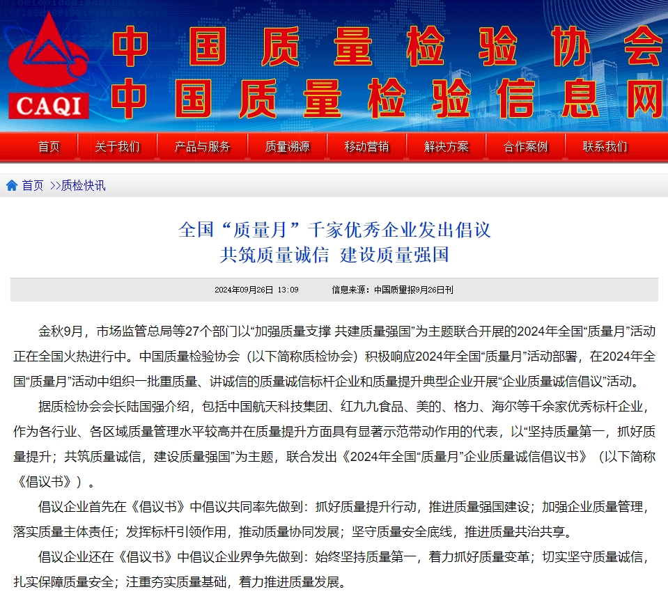 每年9月是全國“質(zhì)量月”,由市場監(jiān)管總局等27個(gè)部門以“加強(qiáng)質(zhì)量支撐 共建質(zhì)量強(qiáng)國”為主題,聯(lián)合開展的“質(zhì)量月”活動(dòng)。在2024年全國“質(zhì)量月”活動(dòng)中組織一批重質(zhì)量、講誠信的質(zhì)量誠信標(biāo)桿企業(yè)和質(zhì)量提升典型企業(yè)開展“企業(yè)質(zhì)量誠信倡議”活動(dòng)。